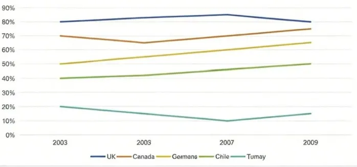 The line graph illustrates changes in the percentage of employed females across five countries (the UK, Canada, Germany, Chile and Turkey) between 2003 and 2009.