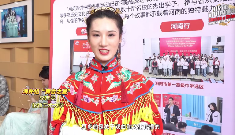 第四届“用英语讲中国故事大会”海外组“舞台之星”李彦旻选手的演讲主题聚焦于中国戏曲的海外传播。她提及英国京昆社作为案例,基于此,她表示作为戏曲爱好者,更愿意在海外传播中国传统戏曲艺术贡献自己的力量。