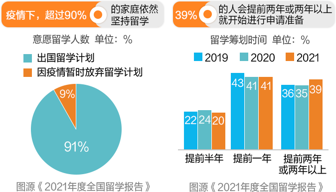 在2021国际教育高峰论坛上发布的《2021年度全国留学报告》,揭示了后疫情时代中国总体留学形势的变化,报告指出:疫情并未明显影响出国留学的实际需求,反而随着意向留学人数的不断增加、竞争激烈度增强,提前规划、提前准备的留学意识被越来越多的人所认可。