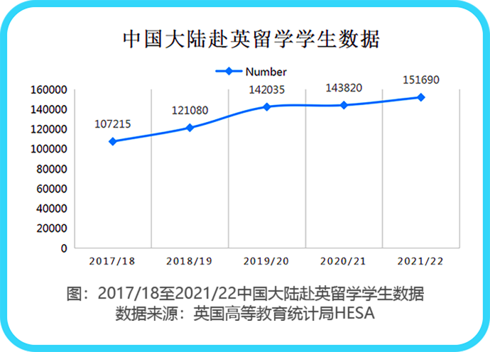 英国高等教育统计局(HESA)数据显示,2021/2022年度在英中国内地学生总数为151,690人,同比增长10%。中国以17万留学生人数位列非欧盟地区留学生人数排名第一。