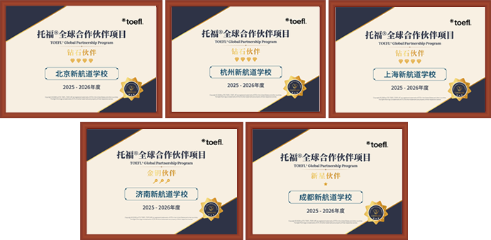 作为托福官方长期合作伙伴,新航道连续六年获授最高荣誉的合作伙伴奖(2020-2024:“托福联盟项目三星级成员”;2025:“托福全球合作伙伴项目钻石伙伴”)。2025年度托福全球合作伙伴项目评级结果,新航道旗下共有5所学校上榜,其中新航道北京学校、新航道杭州学校、新航道上海学校被评选为托福钻石伙伴(最高荣誉)。