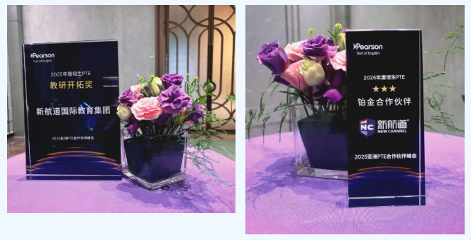 新航道国际教育集团考试研究院院长董悦和新航道杭州学校PTE教学负责人吕诗雯老师受邀出席本次峰会并上台领奖。